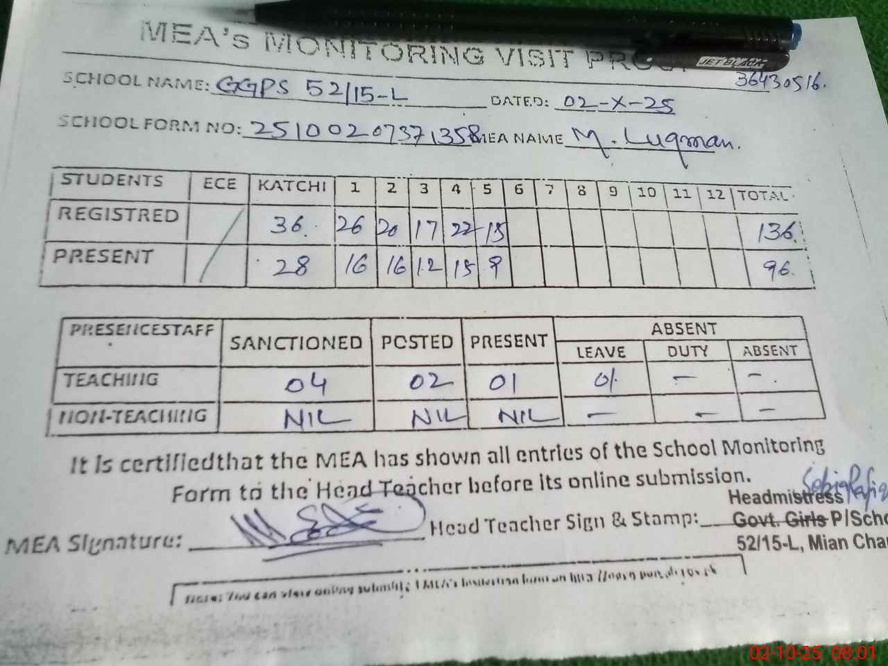 | Certified that this School was Inspected by the Undersigned MEA/DMO Today and the Information Stated Above is as Per Record. | |||||