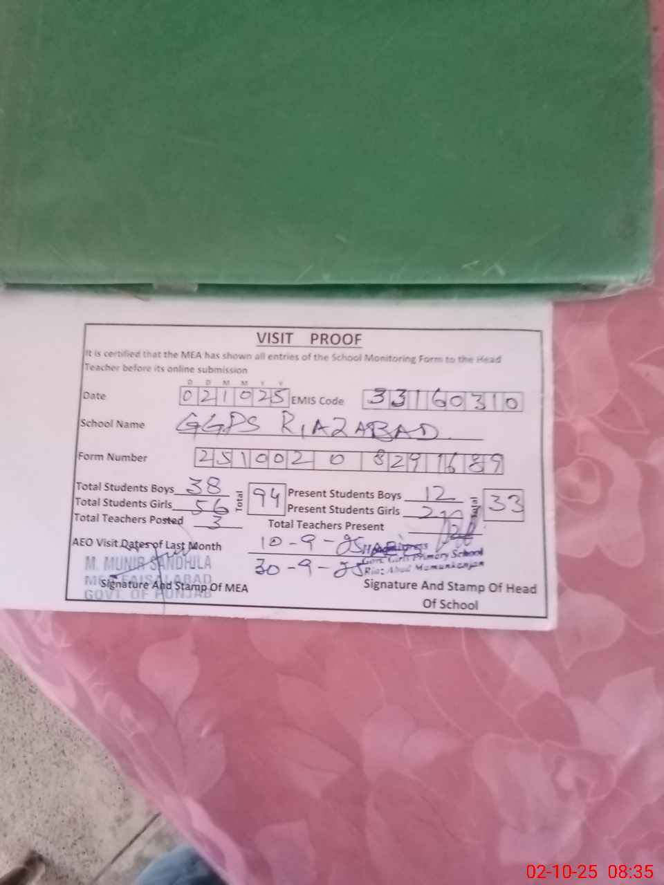 | EMIS Code: 33160310 | Name of School: GGPS RIAZ ABAD MAMUNKANJAN | |||
