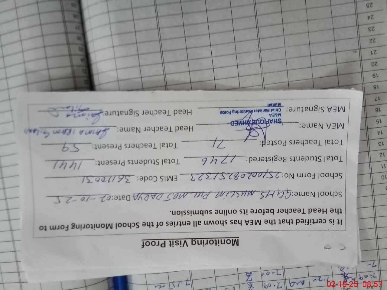 | Monitoring Date: 02-10-2025 | Start Time: 02-10-2025 08:25 AM | End Time: 02-10-2025 08:57 AM | Name of MEA: SH**** AH**** | |