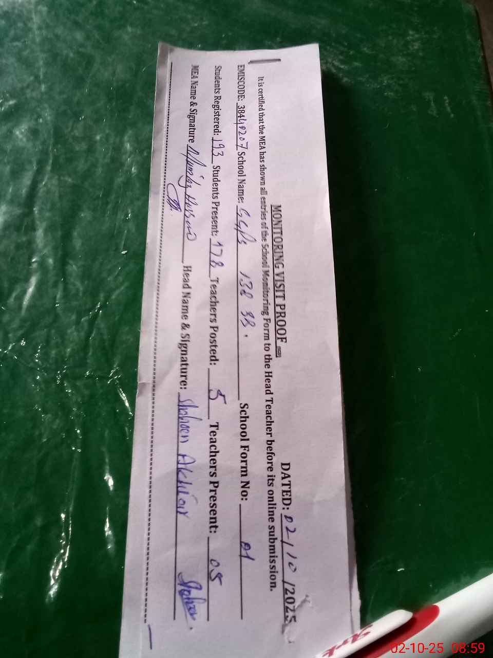 | Certified that this School was Inspected by the Undersigned MEA/DMO Today and the Information Stated Above is as Per Record. | |||||