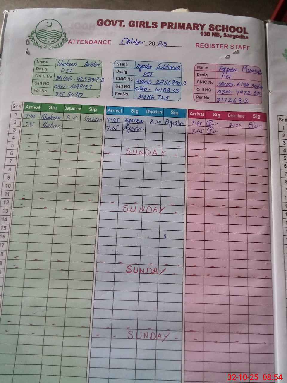 | CNIC | Full Name | Designation | R/C | Absence During Last Calender Month |