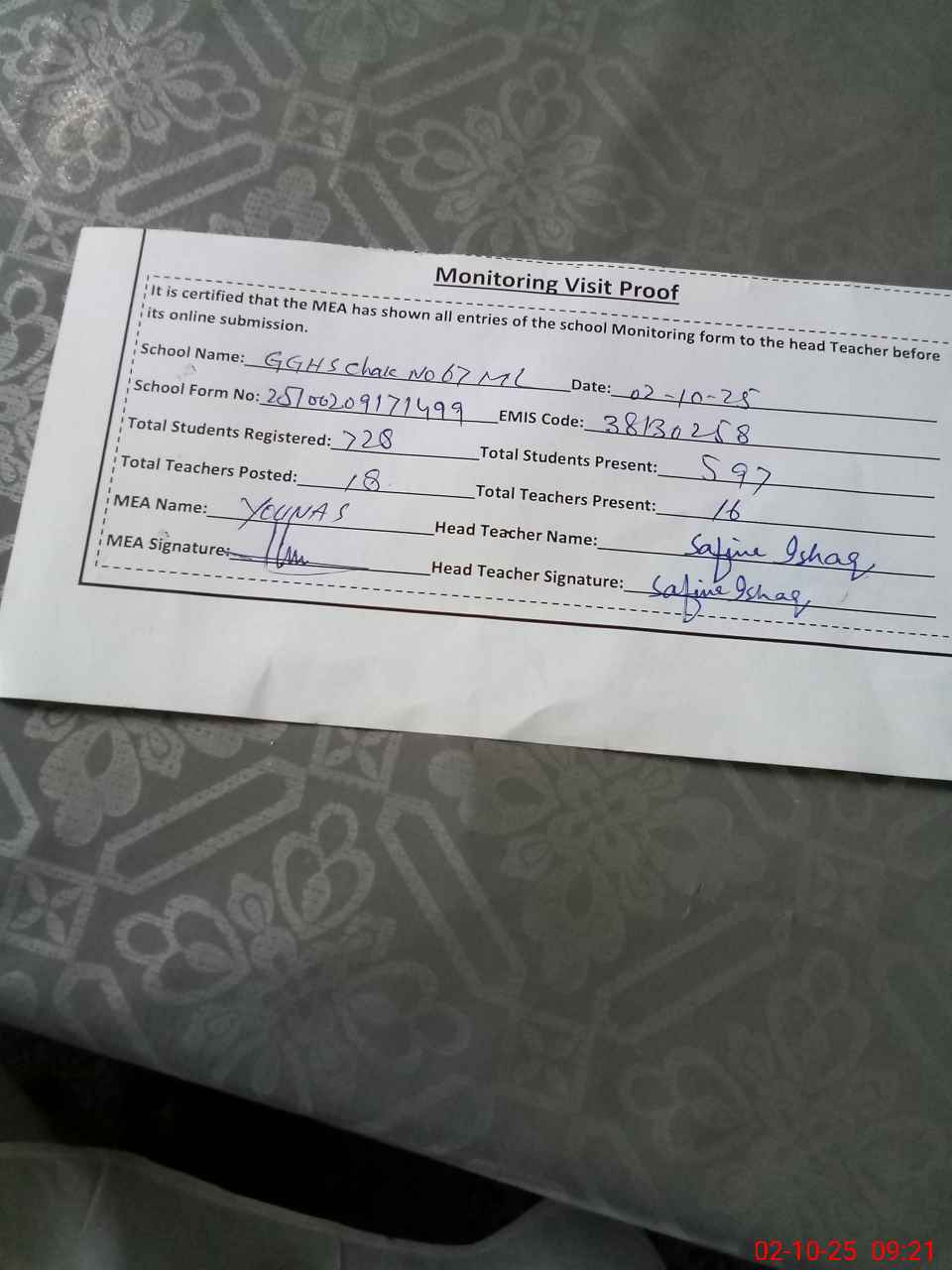| EMIS Code: 38130258 | Name of School: GGHS CHAK NO.67/ML | |||