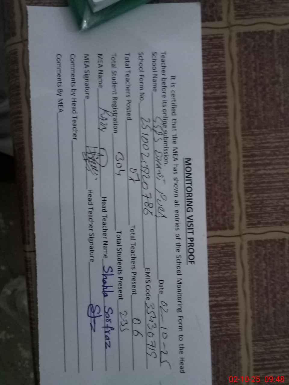 | Certified that this School was Inspected by the Undersigned MEA/DMO Today and the Information Stated Above is as Per Record. | |||||