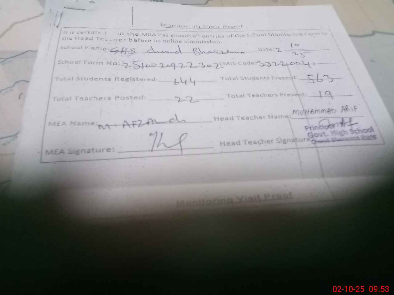 | Certified that this School was Inspected by the Undersigned MEA/DMO Today and the Information Stated Above is as Per Record. | |||||