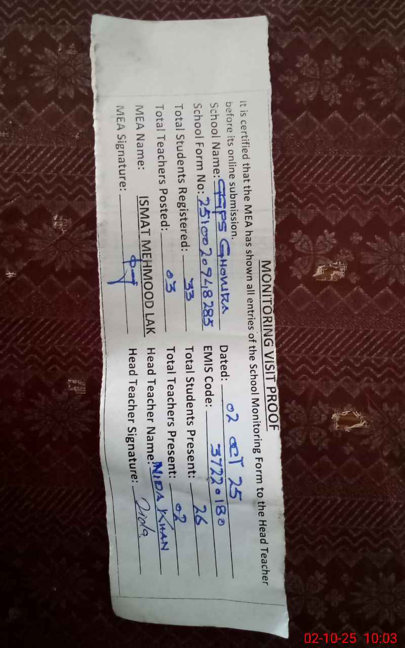 | EMIS Code: 37220180 | Name of School: GGPS GHOWRA | |||