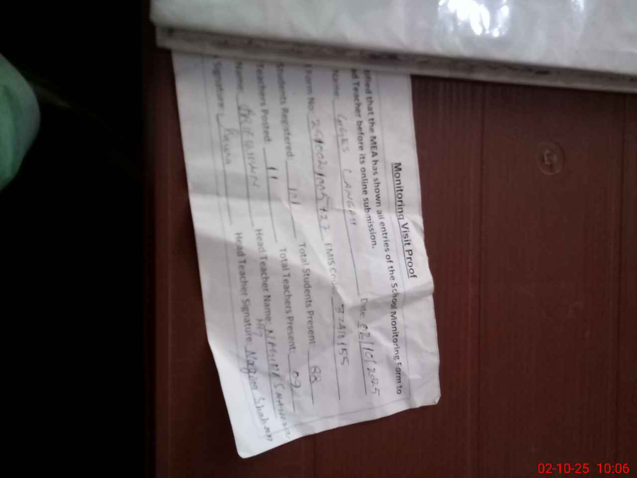 | Certified that this School was Inspected by the Undersigned MEA/DMO Today and the Information Stated Above is as Per Record. | |||||