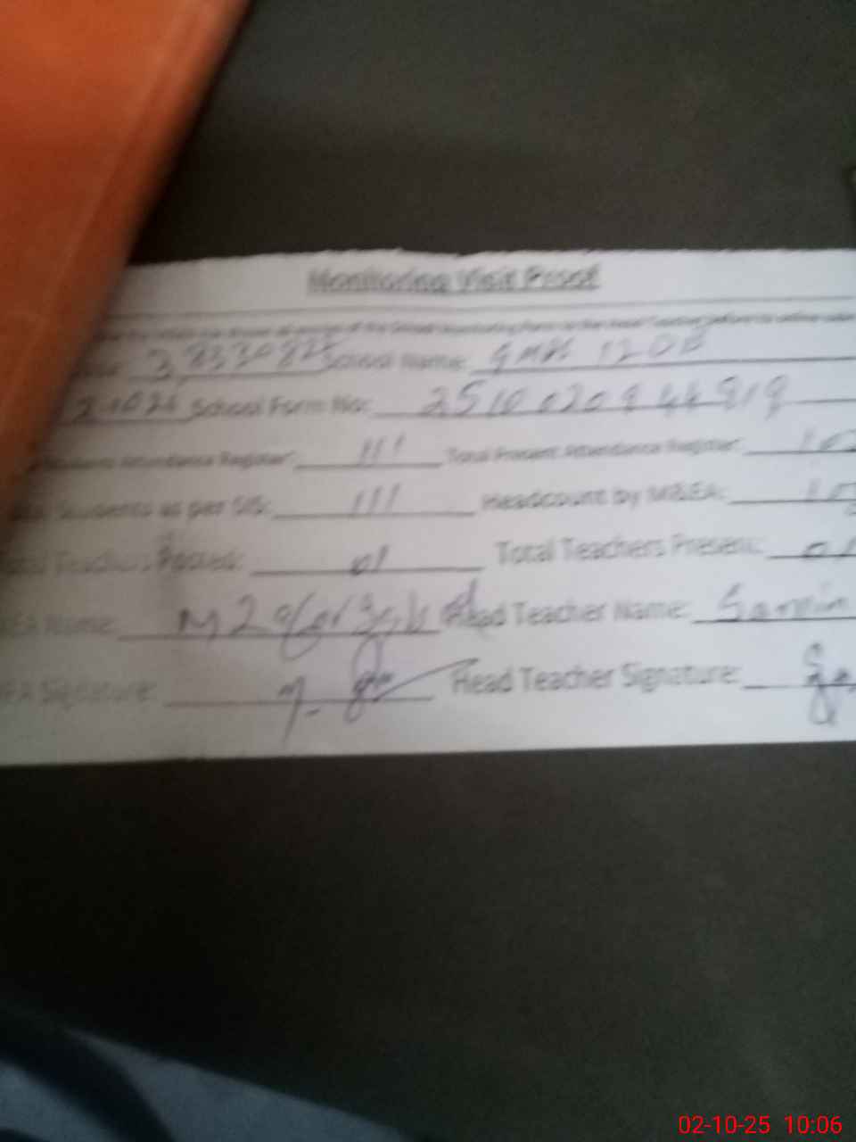 | Attendance Register | Head Teacher | MEA with School | Visit Proof |