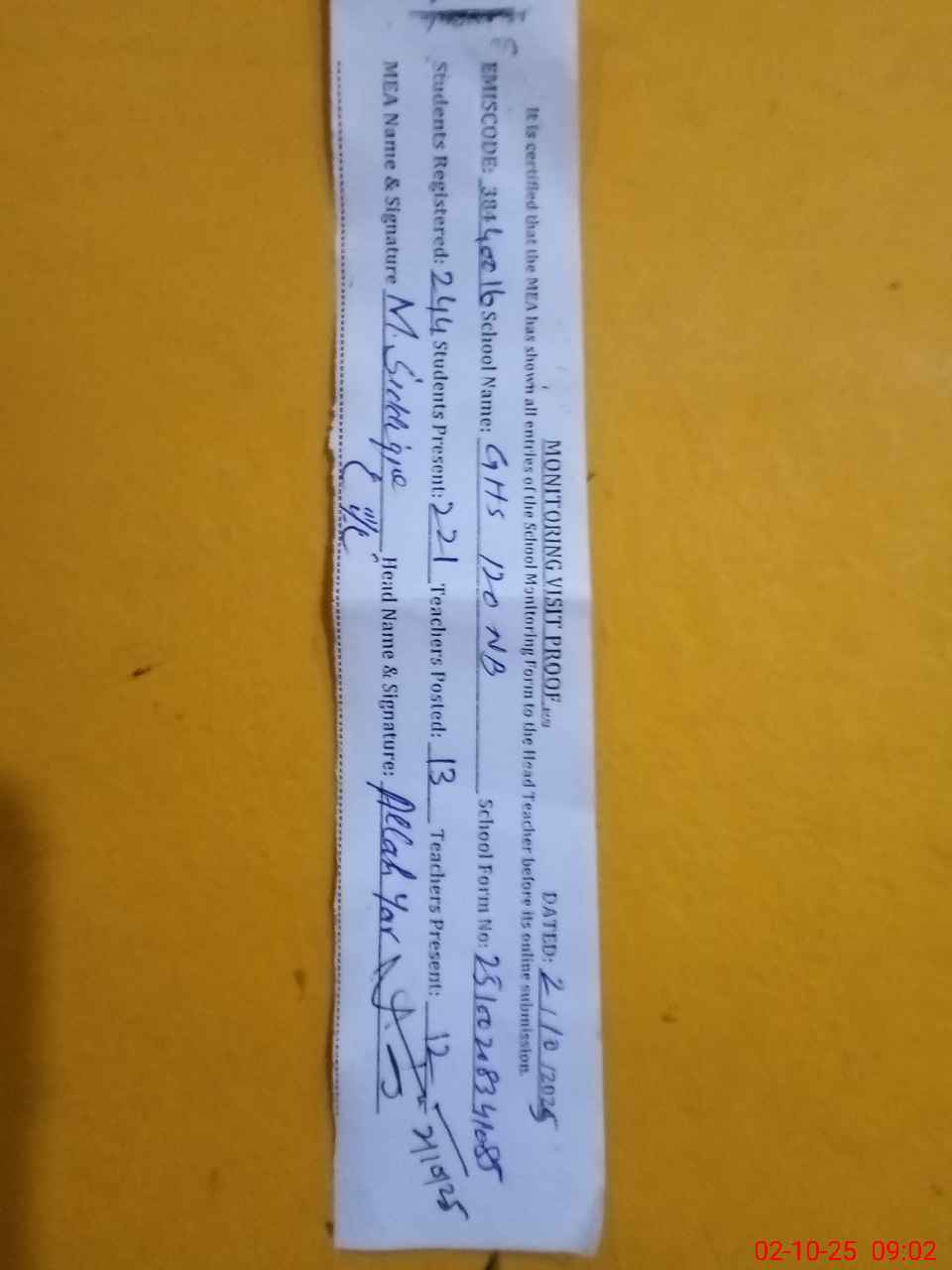 | Attendance Register | Head Teacher | MEA with School | Visit Proof |