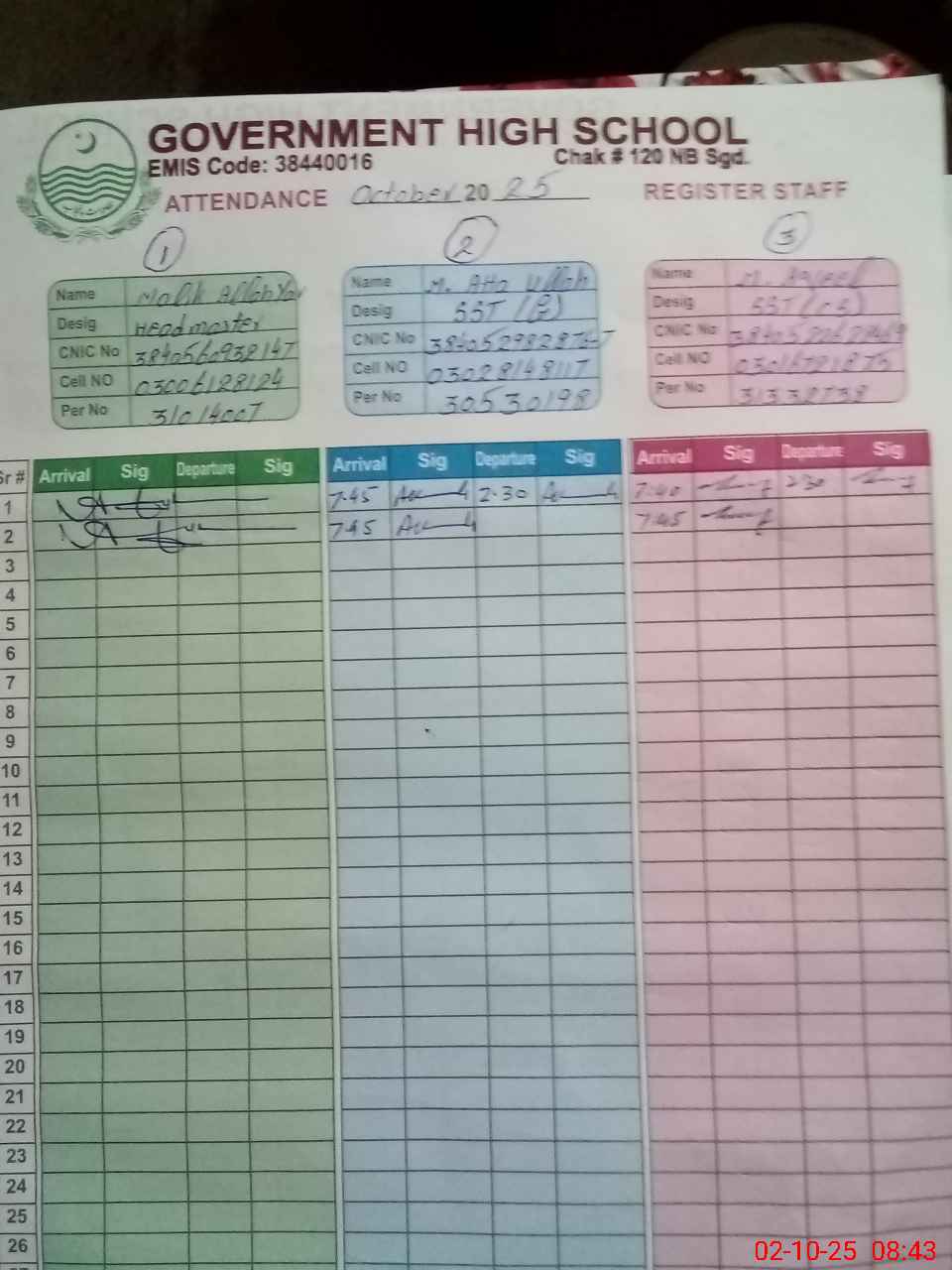 | CNIC | Full Name | Designation | R/C | Absence during last cal. month |