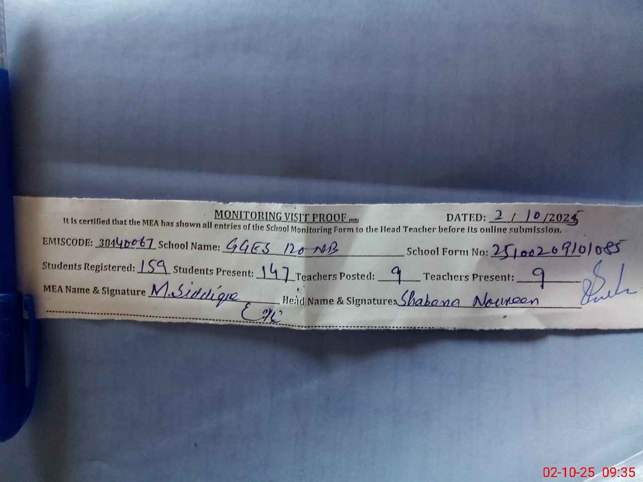 | Monitoring Date: 02-10-2025 | Start Time: 02-10-2025 09:10 AM | End Time: 02-10-2025 09:37 AM | Name of MEA: MU**** SI**** | |