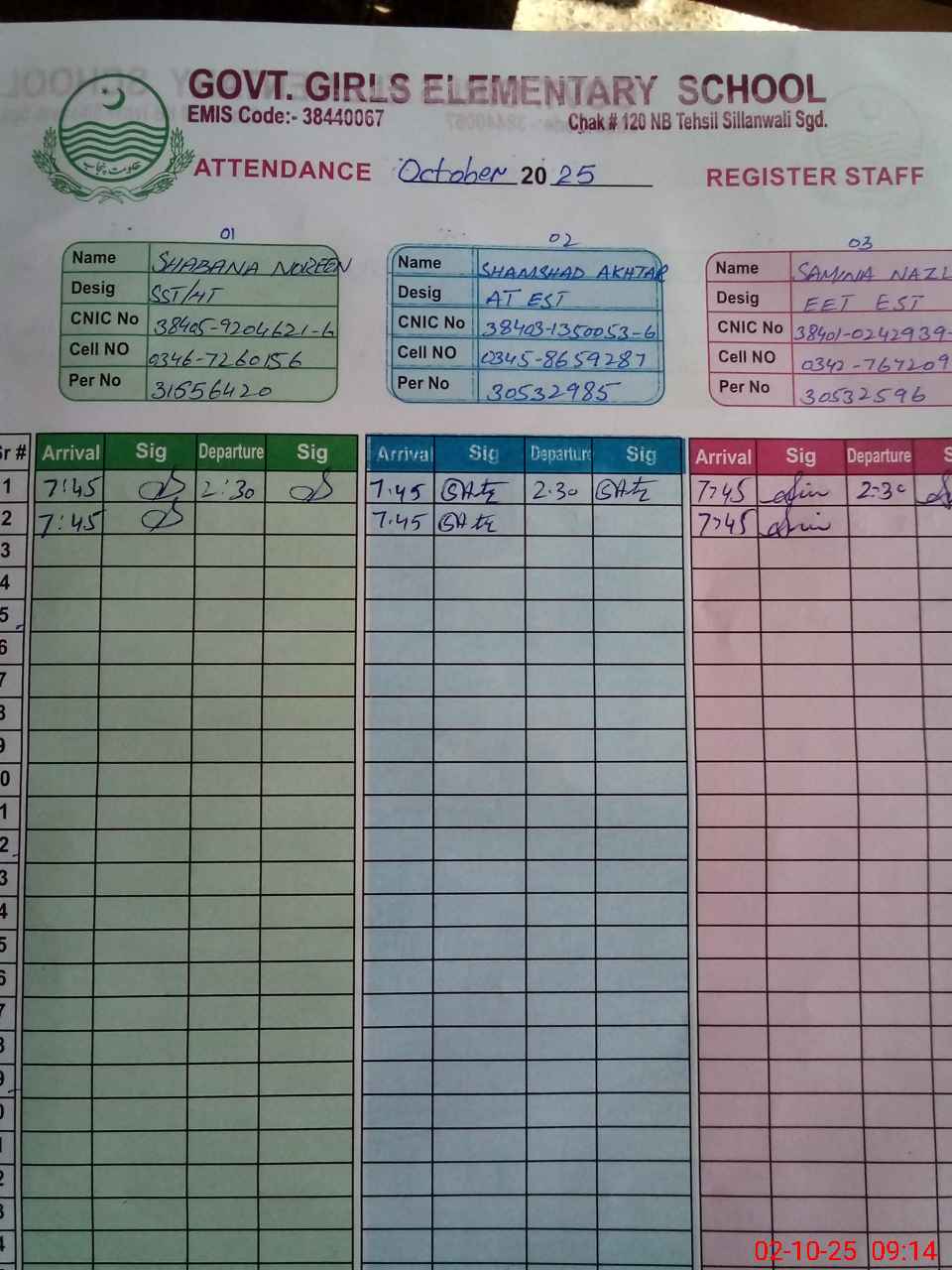 | CNIC | Full Name | Designation | R/C | Absence during last cal. month |