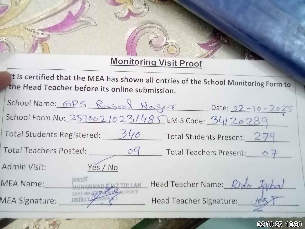 | Attendance Register | Head Teacher | MEA with School | Visit Proof |