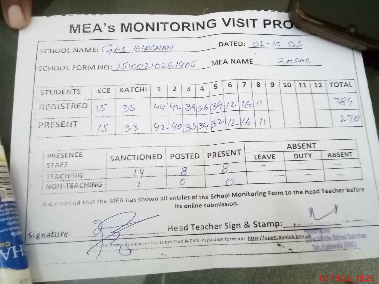 | Attendance Register | Head Teacher | MEA with School | Visit Proof |