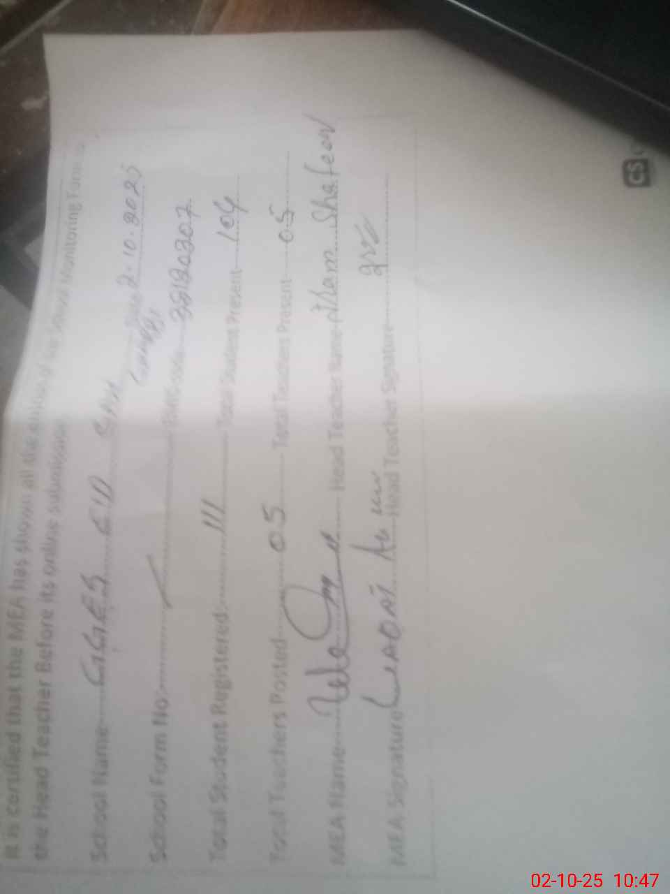 | Attendance Register | Head Teacher | MEA with School | Visit Proof |