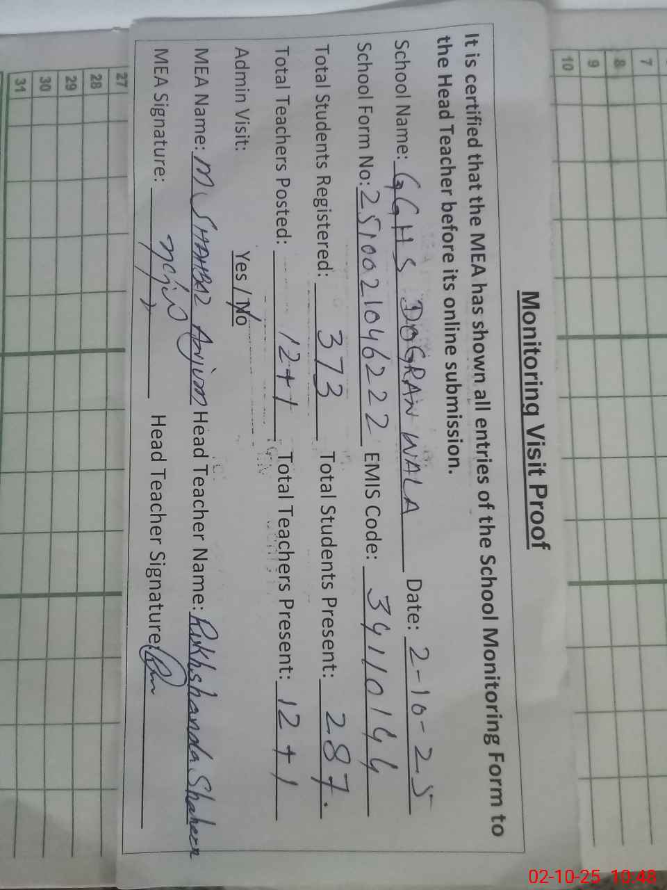 | EMIS Code: 34110144 | Name of School: GGHS DOGRAN WALA | |||