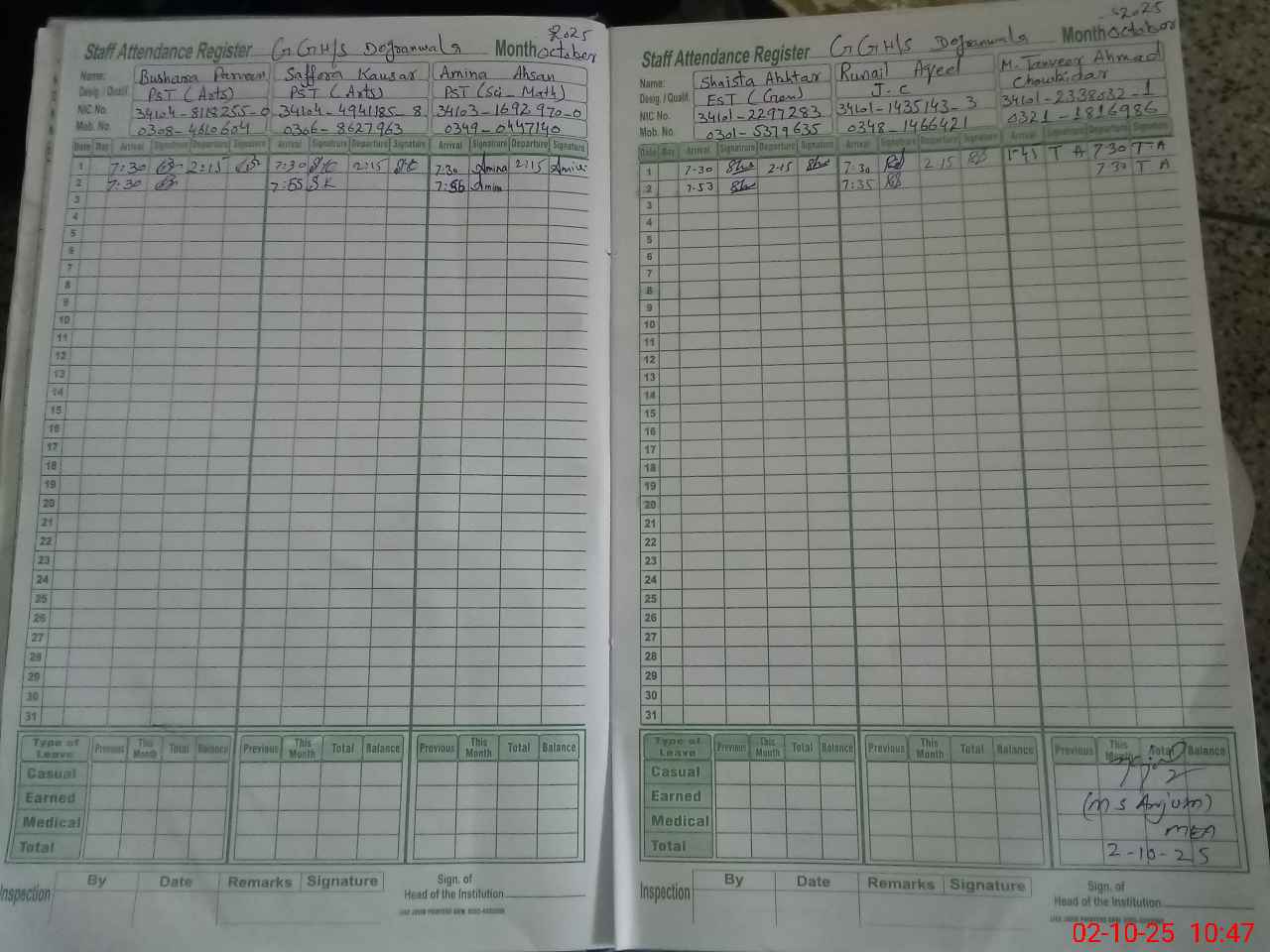 | Total no. of Classrooms: 19 No. of Classrooms Used for Teaching: 10 No. of Classrooms Storing Old Furniture, FTBs, etc: 0Comments if Any: AVERAGE CONDITION OF BUILDING AND SCHOOL NSB AND FTF RECORD WELL MAINTAINED IN TAB AND REGISTER COVID SOPS DISPLAYED AND PARTIALLY FOLLOWING BY STAFF AND STUDENTS TEMPERATURE GUN AVAILABLE SANITIZER AVAILABLE CLEANLINESS OF SCHOOL IS CARRIED OUT BY S |