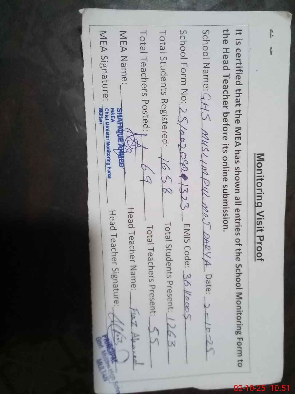 | EMIS Code: 36110005 | Name of School: GHS MUSLIM PUL MOJ DARIYA OPP. SPORTS GROUND MULTAN | |||