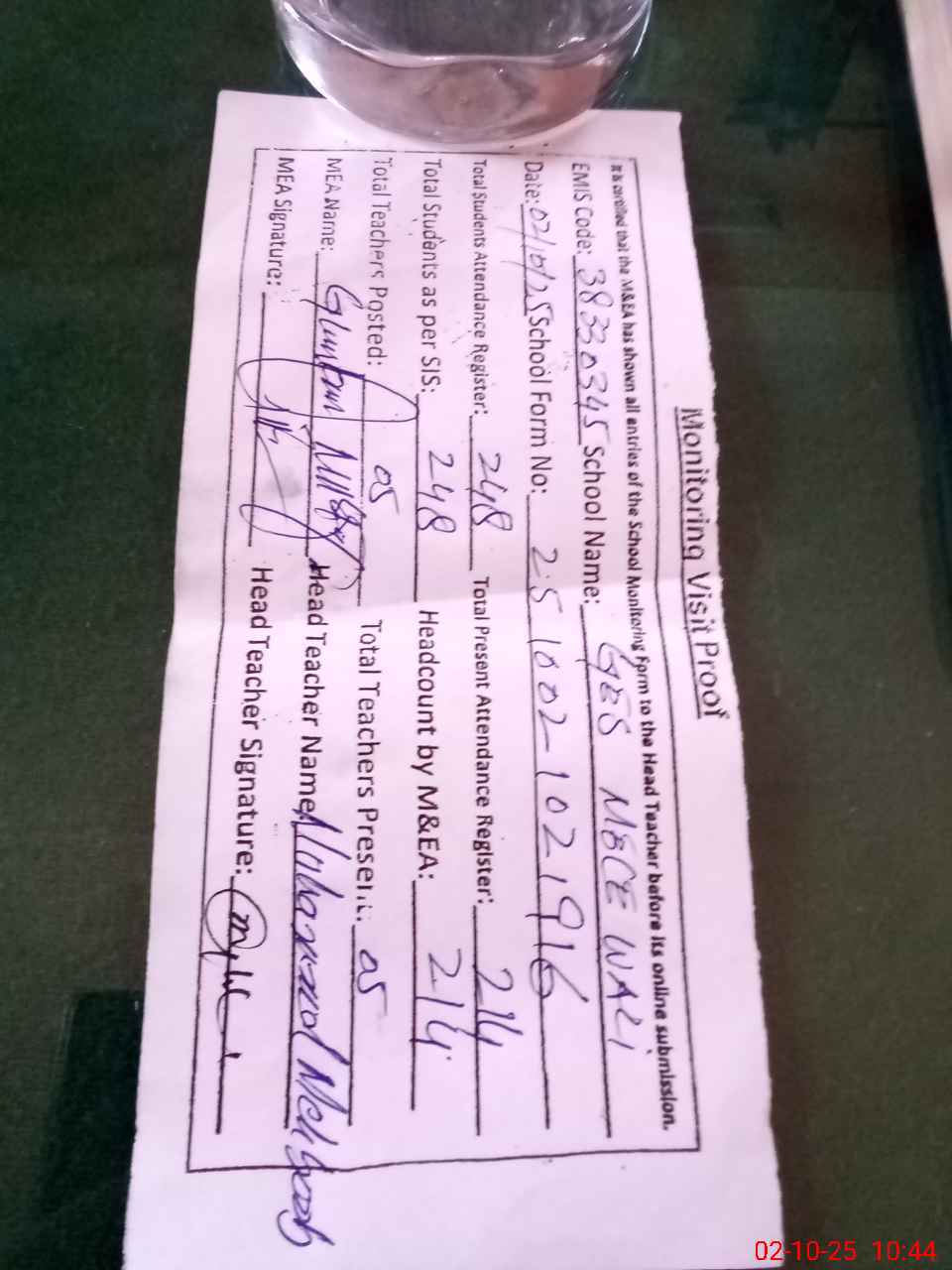 | Monitoring Date: 02-10-2025 | Start Time: 02-10-2025 10:21 AM | End Time: 02-10-2025 11:00 AM | Name of MEA: Gh**** Mu**** | |