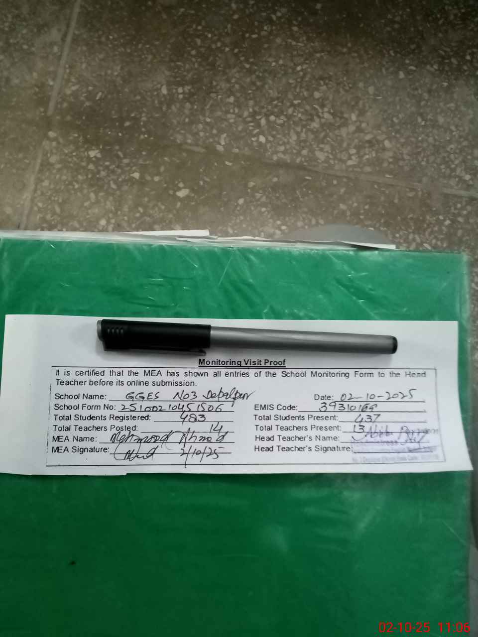 | Attendance Register | Head Teacher | MEA with School | Visit Proof |
