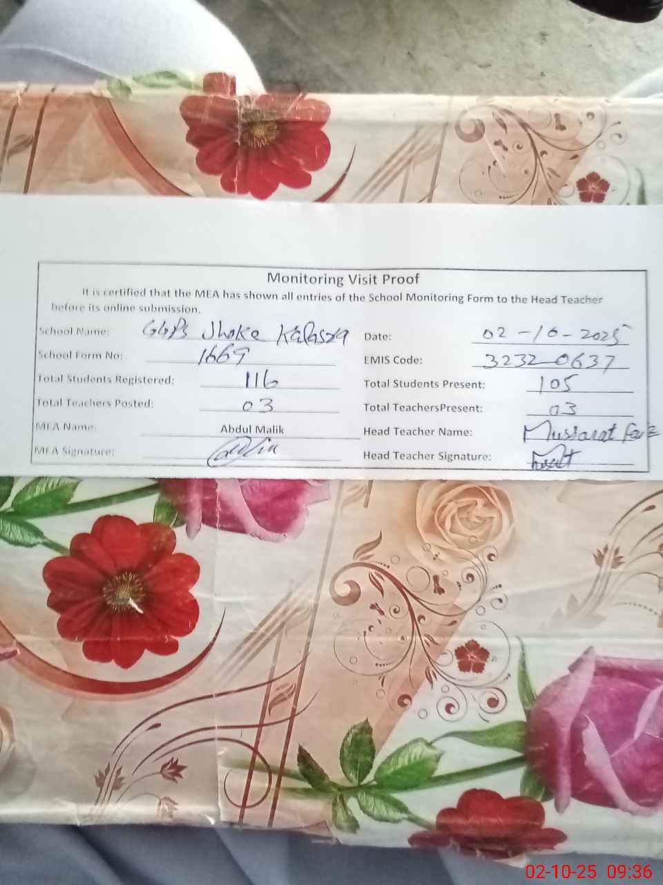 | Attendance Register | Head Teacher | MEA with School | Visit Proof |