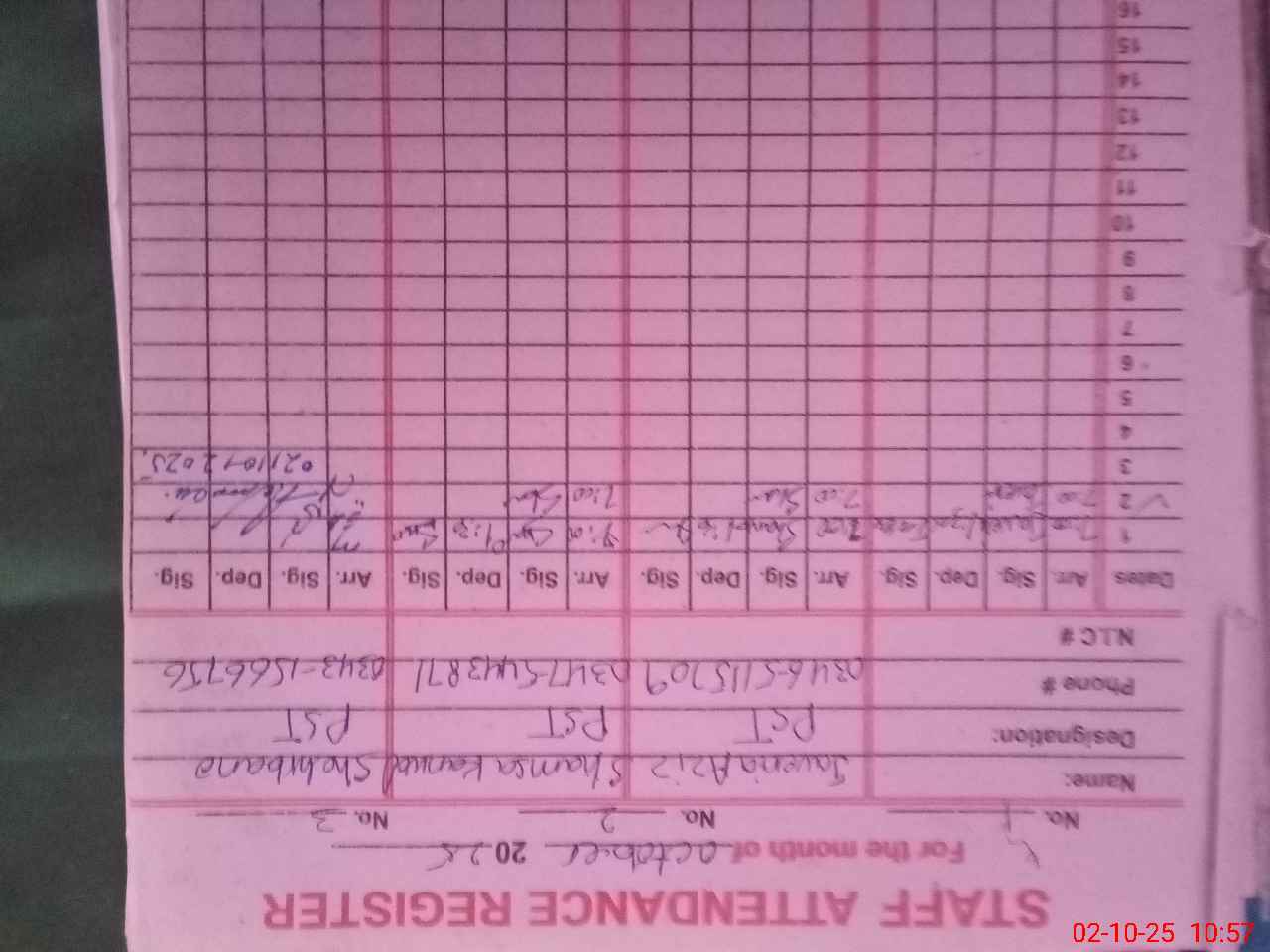 | CNIC | Full Name | Designation | R/C | Absence During Last Calender Month |