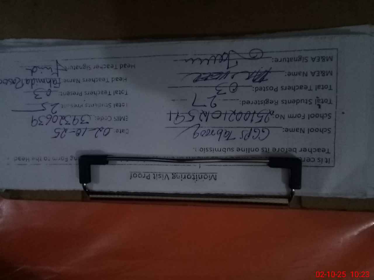 | Attendance Register | Head Teacher | MEA with School | Visit Proof |