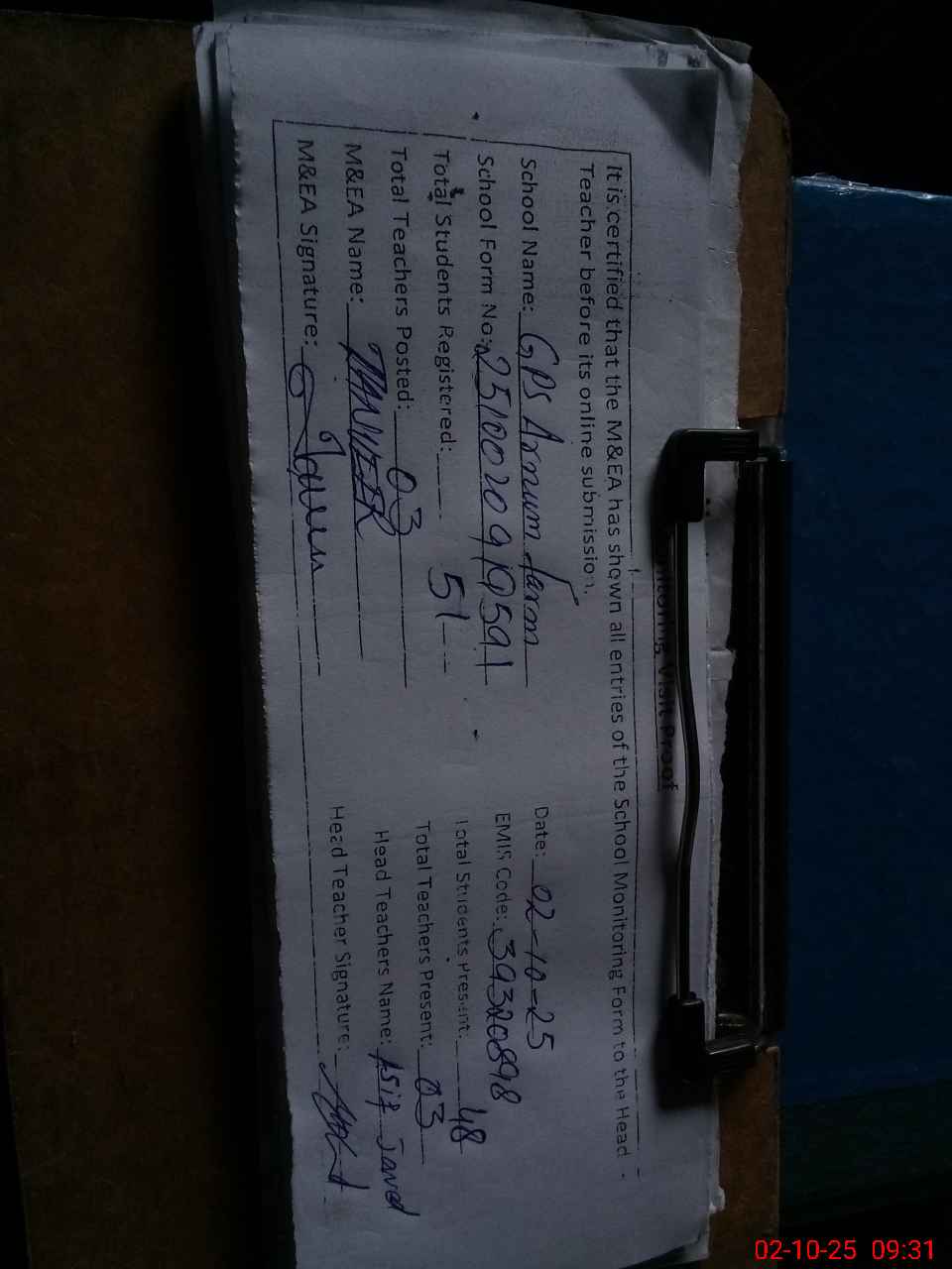 | Attendance Register | Head Teacher | MEA with School | Visit Proof |