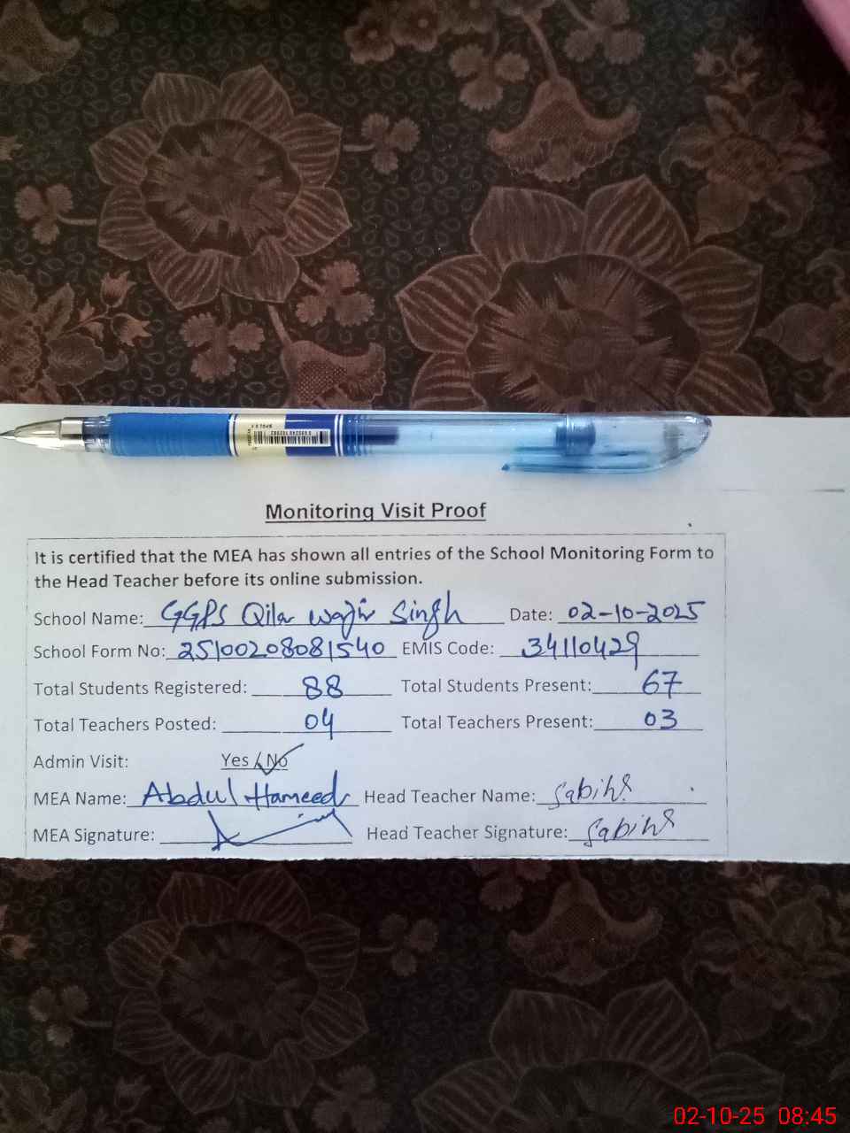 | EMIS Code: 34110429 | Name of School: GGPS QILA WAZIR SING | |||