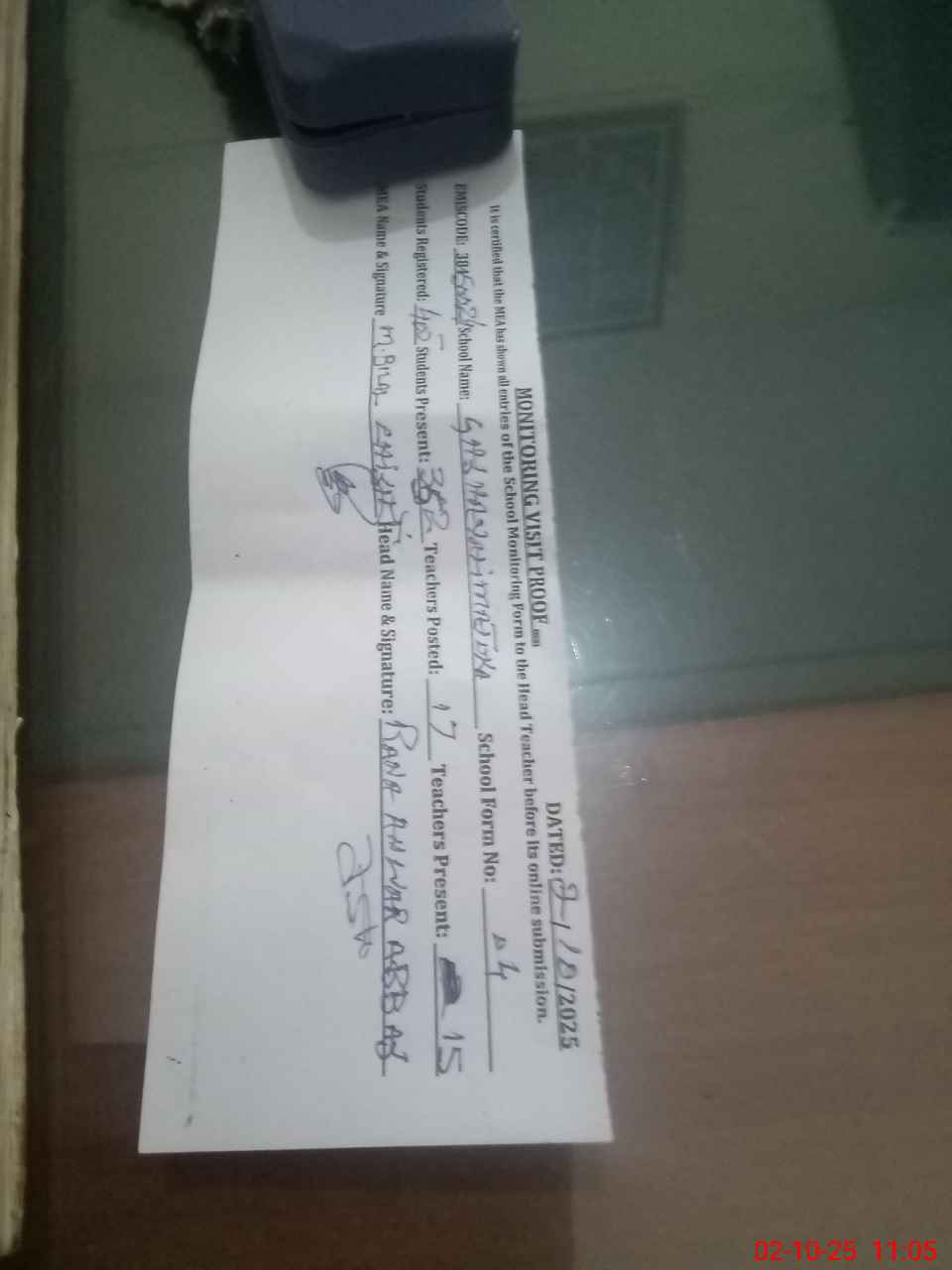 | Attendance Register | Head Teacher | MEA with School | Visit Proof |