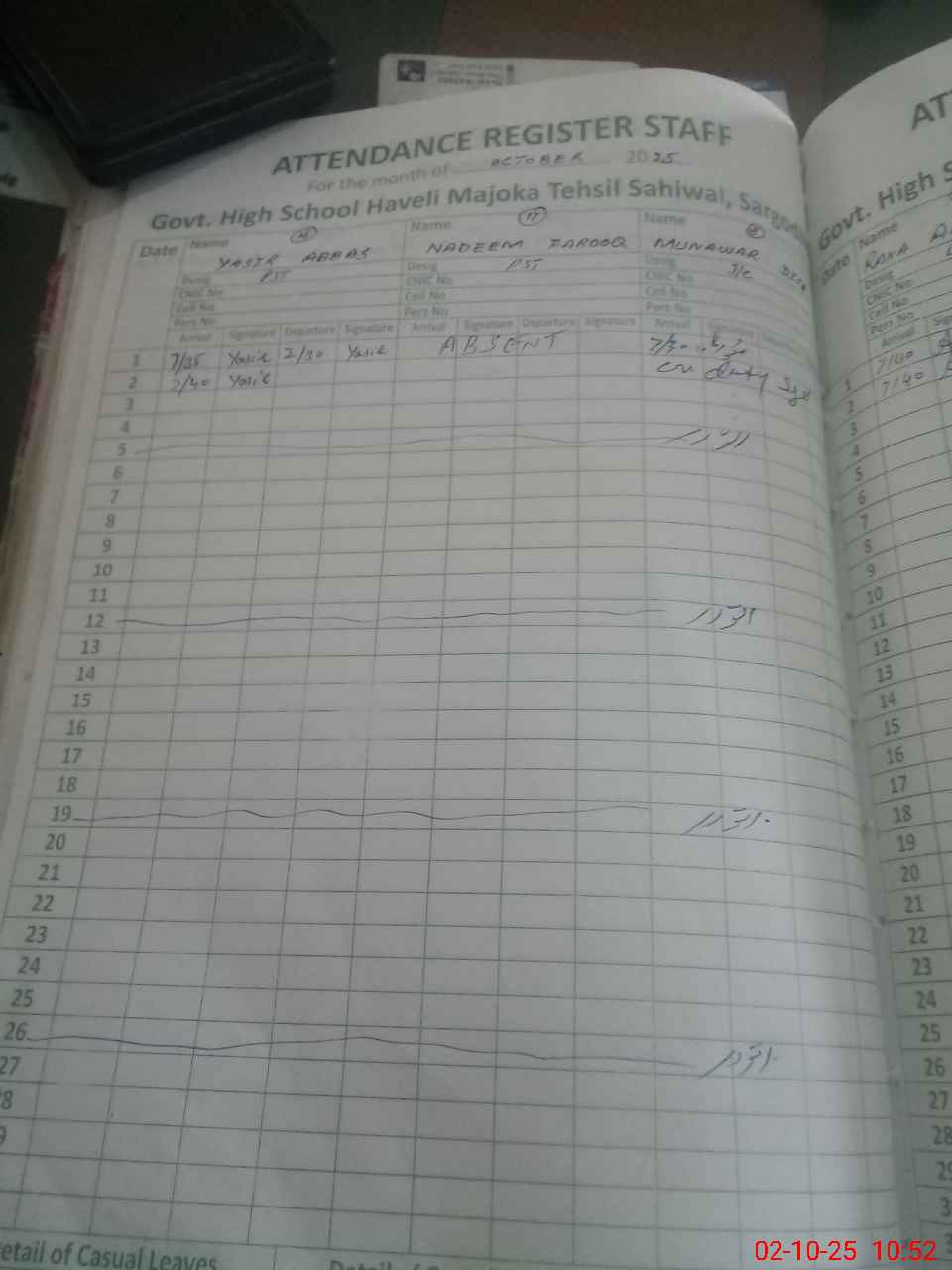 | CNIC | Full Name | Designation | R/C | Absence during last cal. month |