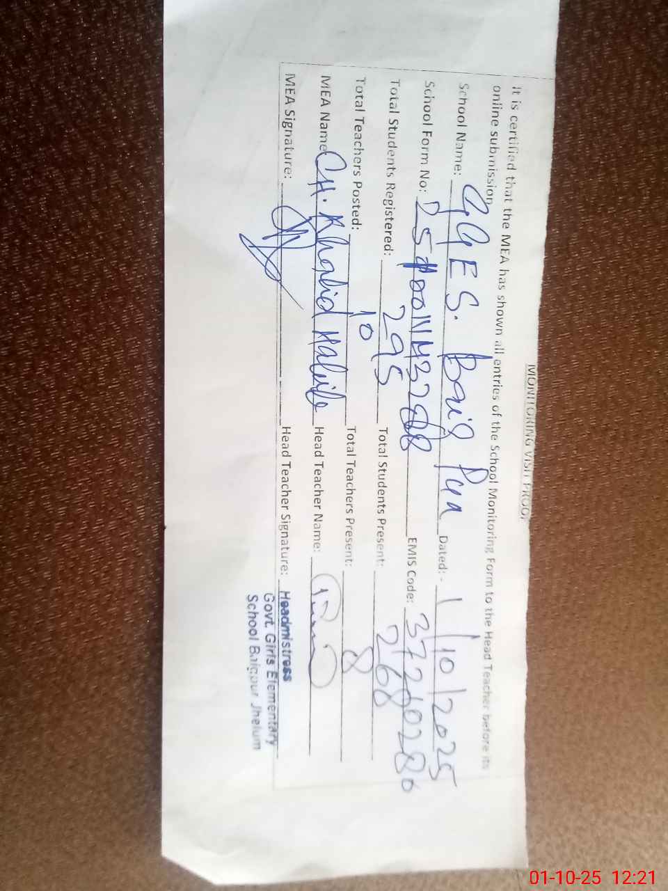| Certified that this School was Inspected by the Undersigned MEA/DMO Today and the Information Stated Above is as Per Record. | |||||