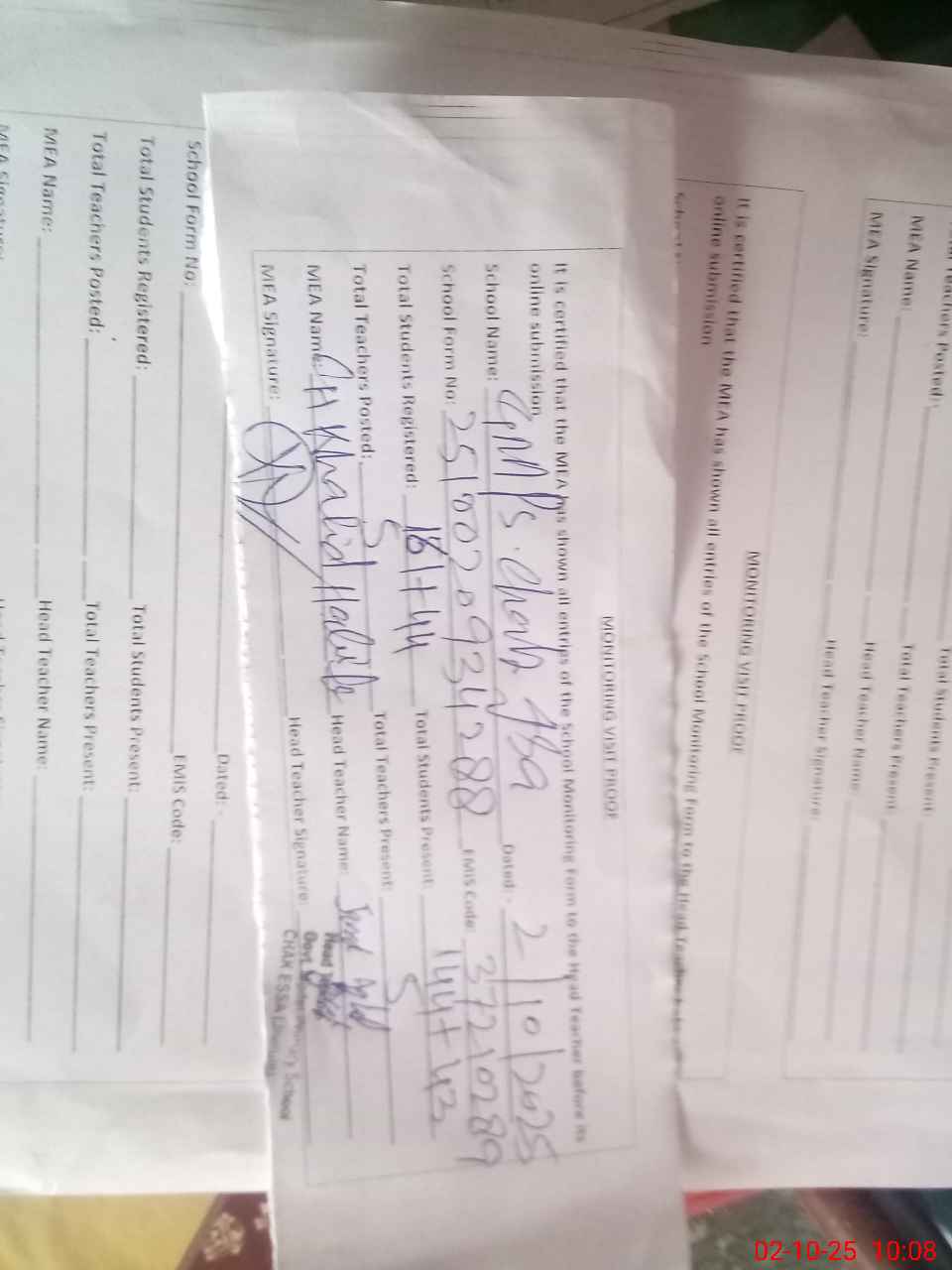 | Certified that this School was Inspected by the Undersigned MEA/DMO Today and the Information Stated Above is as Per Record. | |||||