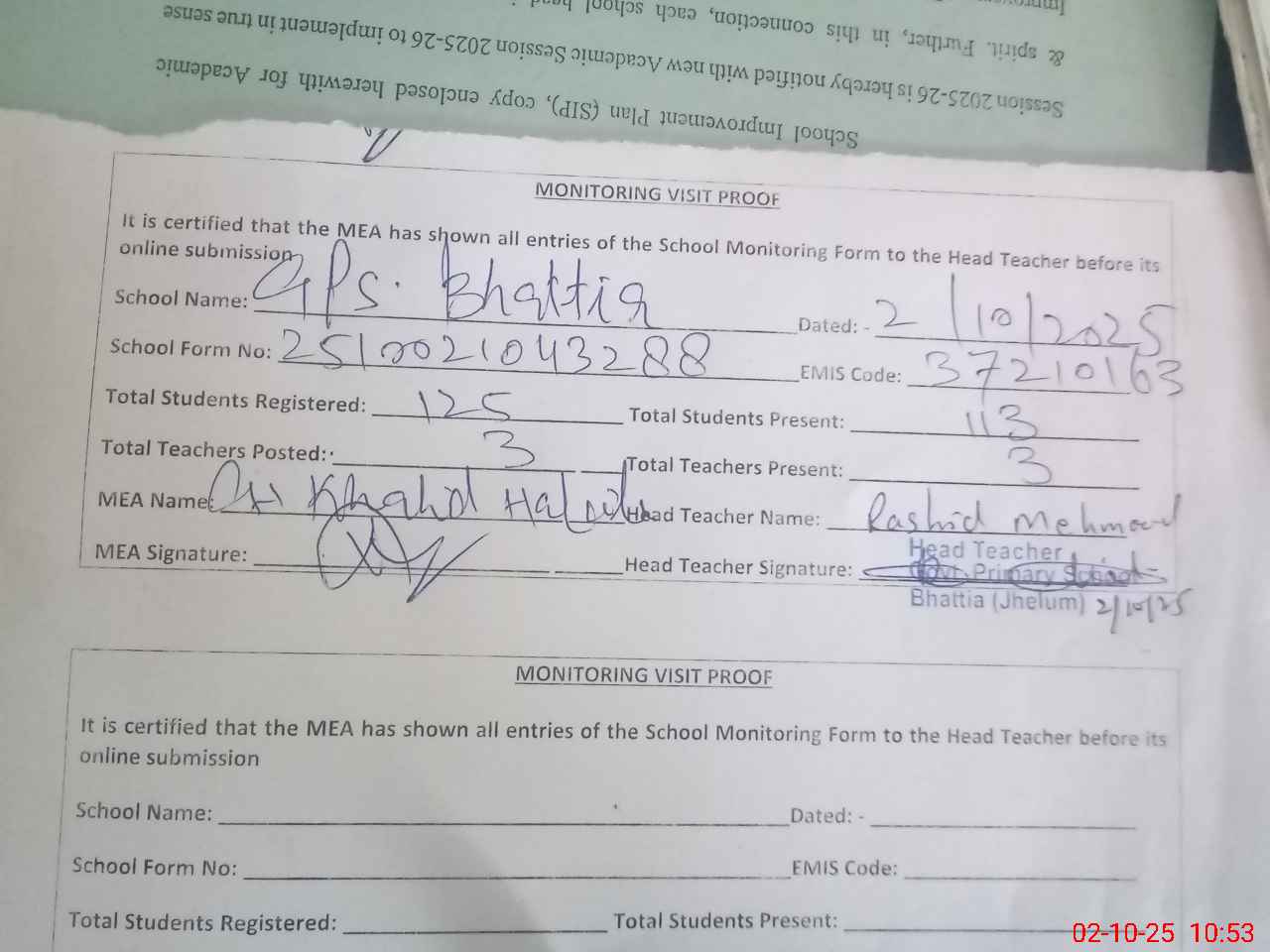 | Certified that this School was Inspected by the Undersigned MEA/DMO Today and the Information Stated Above is as Per Record. | |||||
