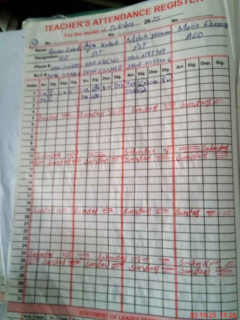 | CNIC | Full Name | Designation | R/C | Absence During Last Calender Month |