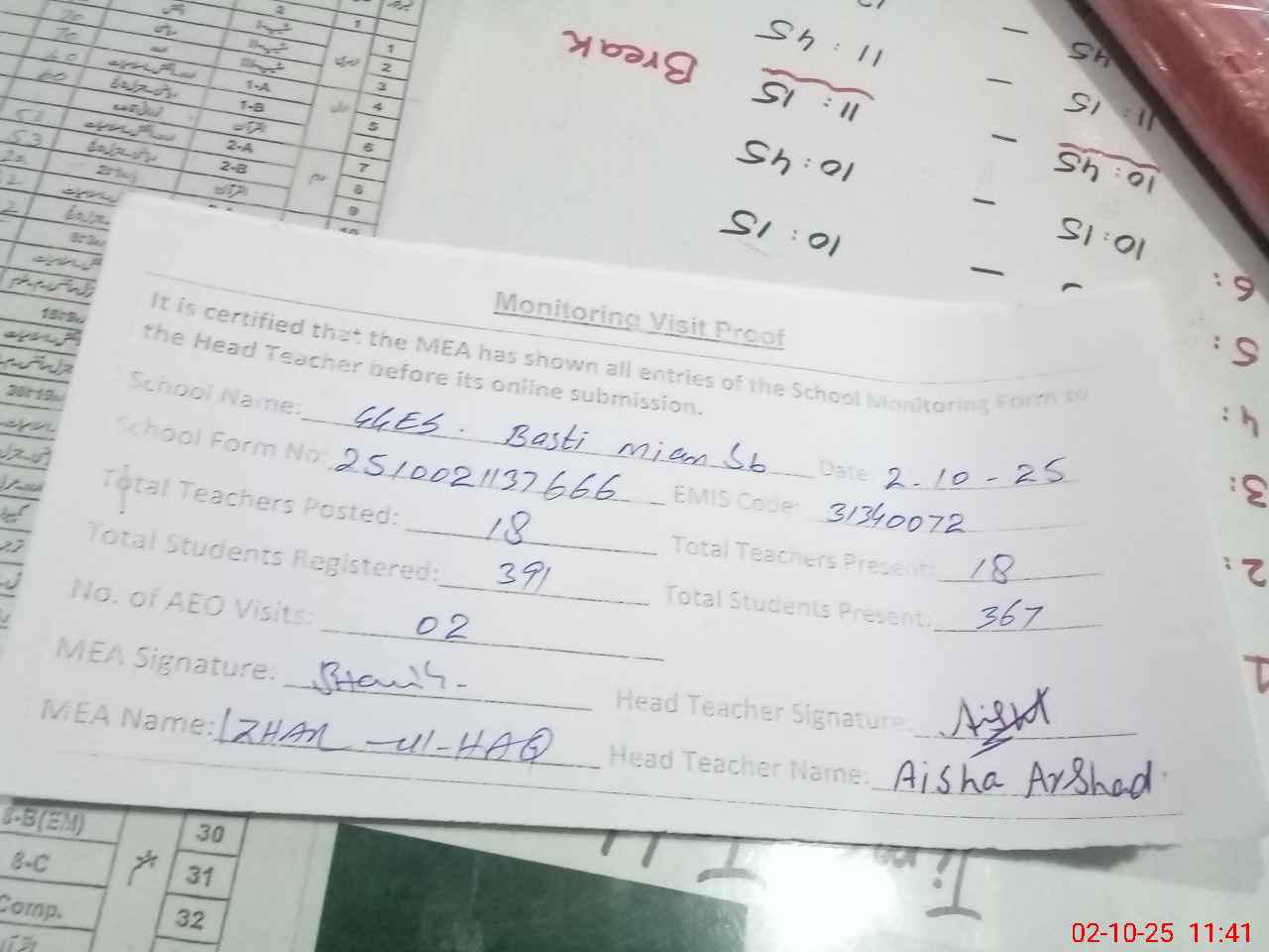 | Attendance Register | Head Teacher | MEA with School | Visit Proof |