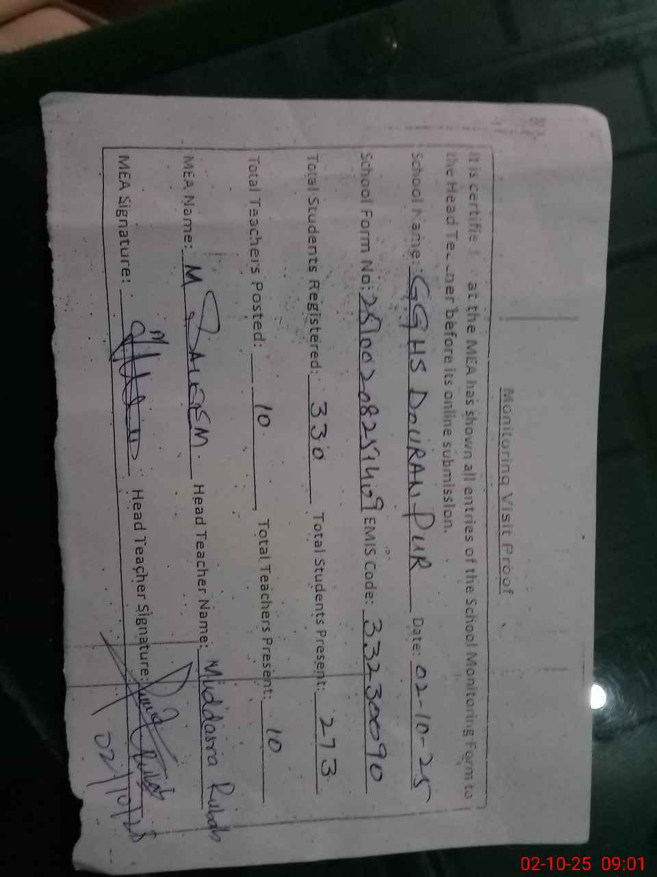 | Attendance Register | Head Teacher | MEA with School | Visit Proof |