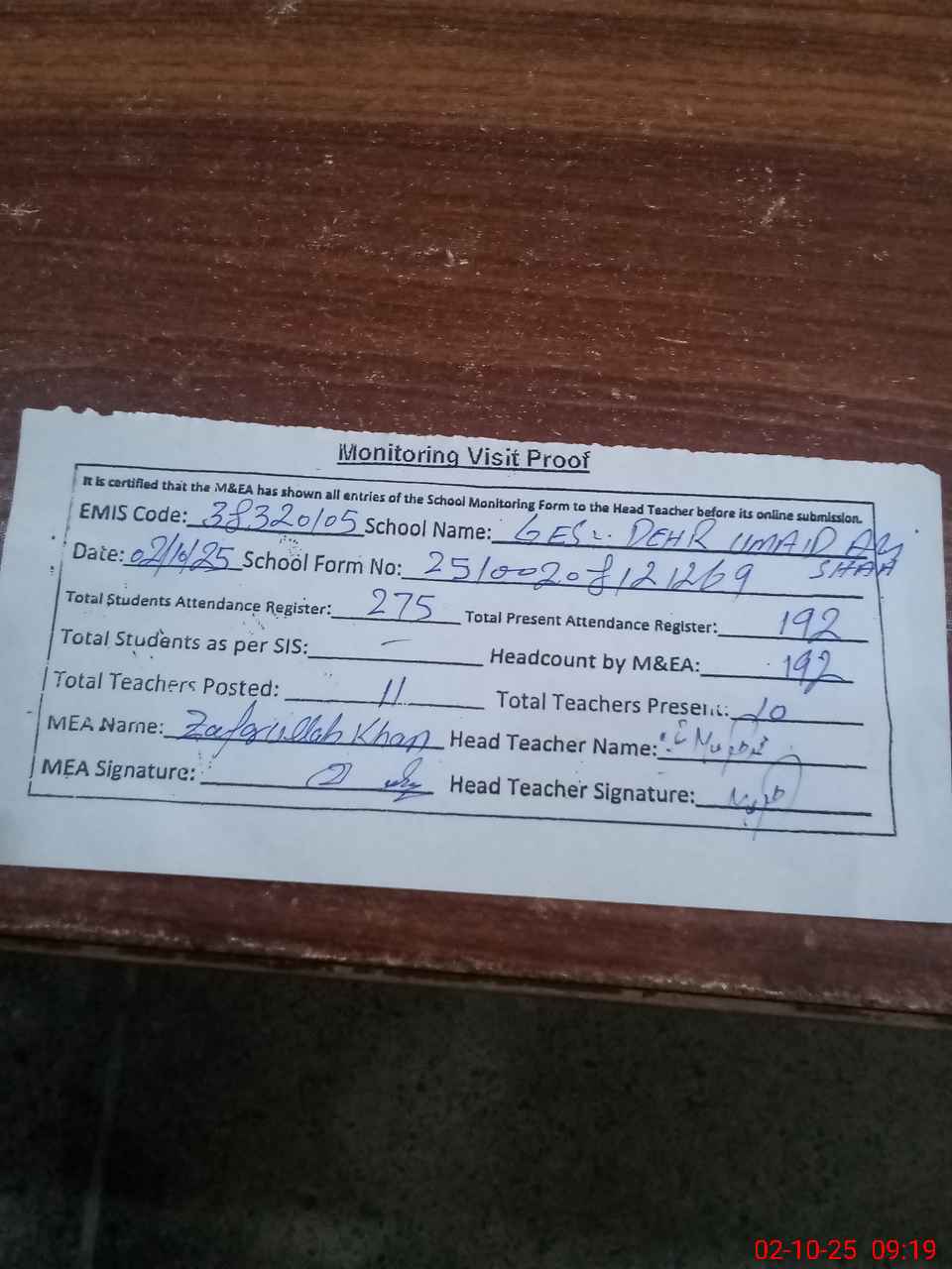 | Attendance Register | Head Teacher | MEA with School | Visit Proof |
