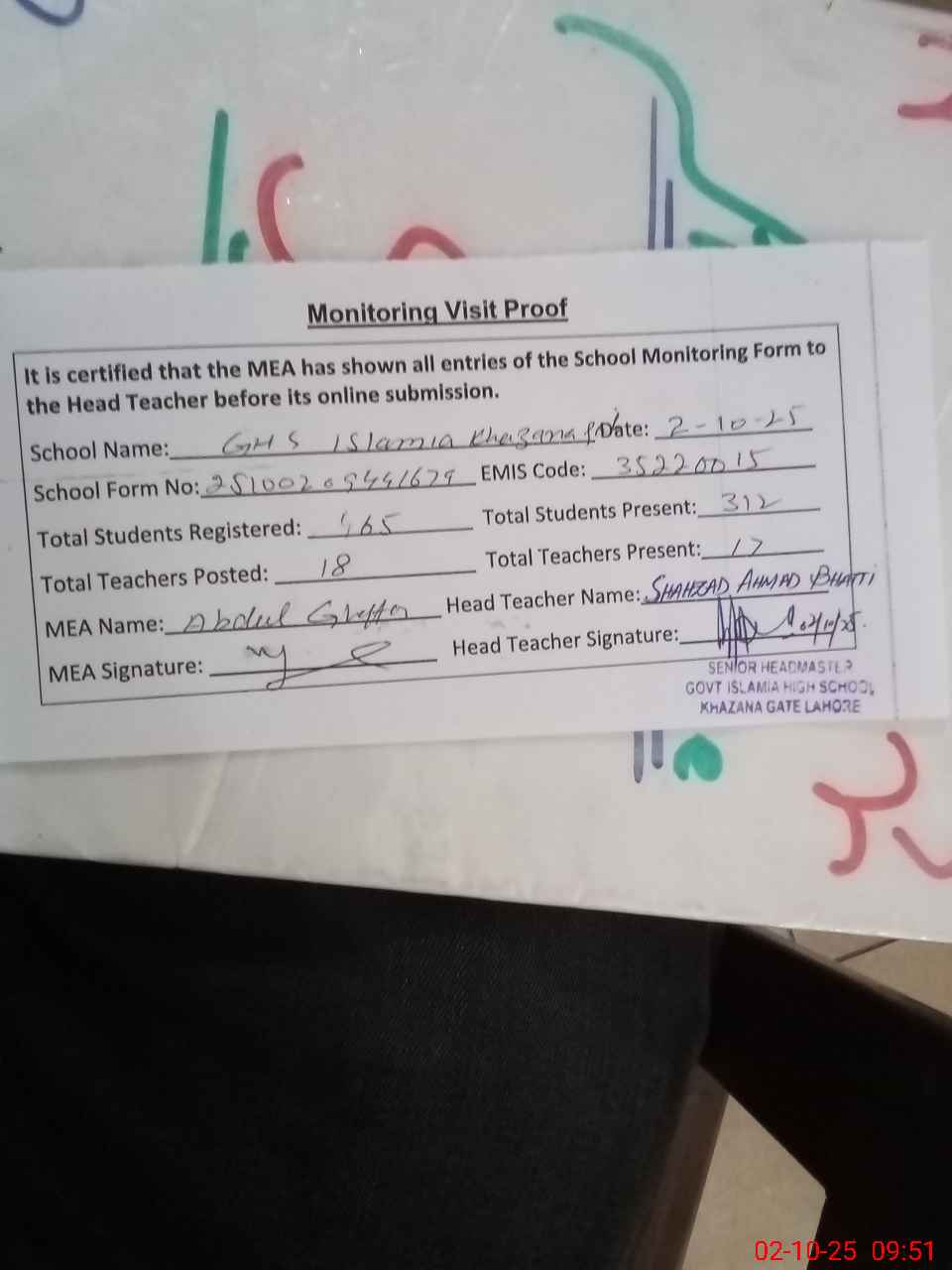 | Certified that this School was Inspected by the Undersigned MEA/DMO Today and the Information Stated Above is as Per Record. | |||||