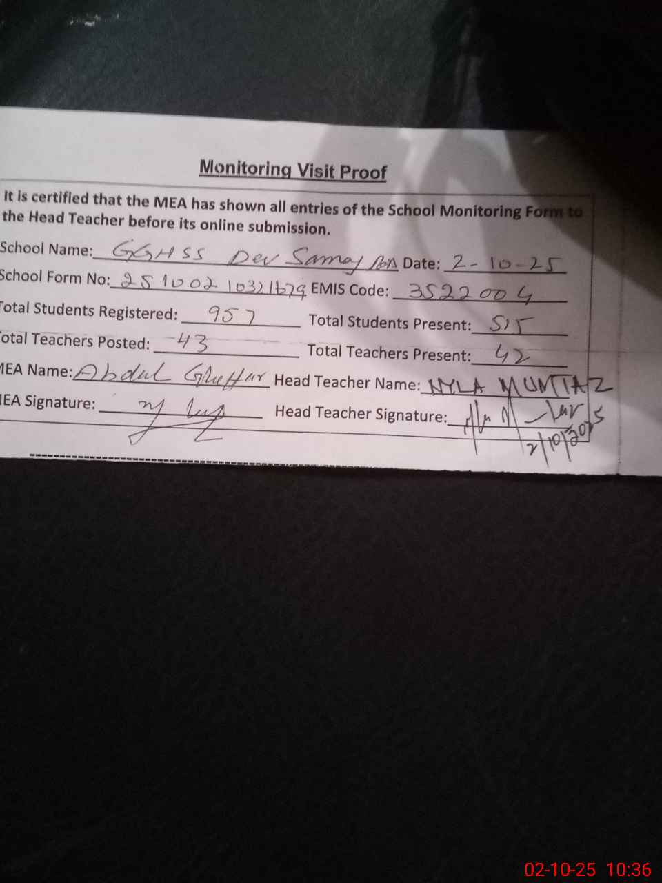 | Certified that this School was Inspected by the Undersigned MEA/DMO Today and the Information Stated Above is as Per Record. | |||||