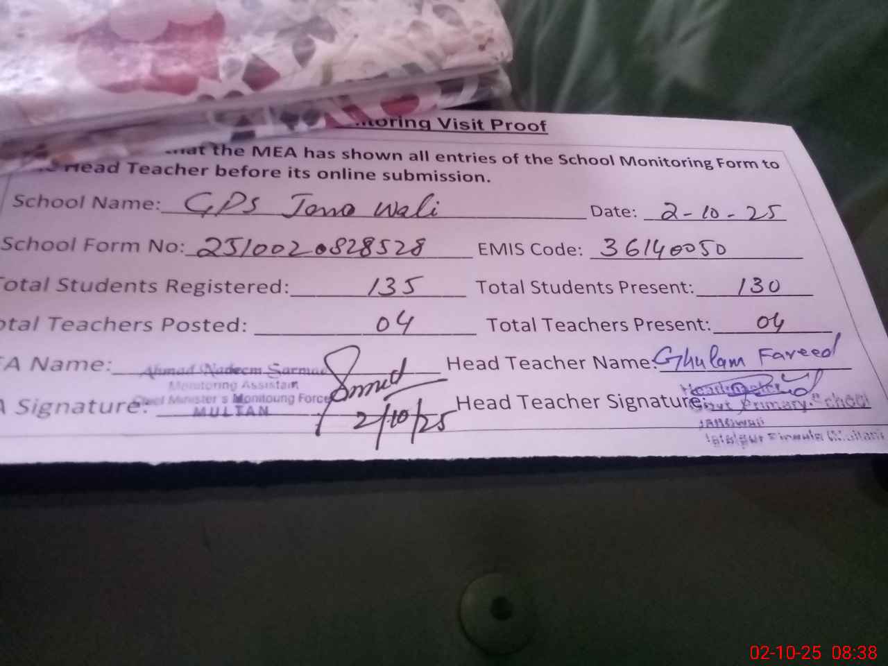 | Attendance Register | Head Teacher | MEA with School | Visit Proof |
