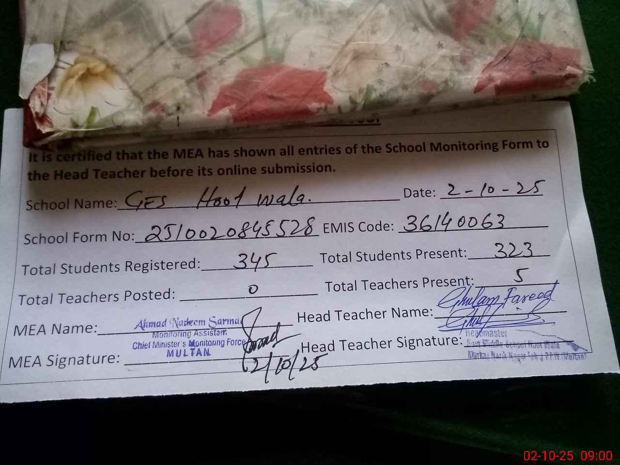 | Certified that this School was Inspected by the Undersigned MEA/DMO Today and the Information Stated Above is as Per Record. | |||||