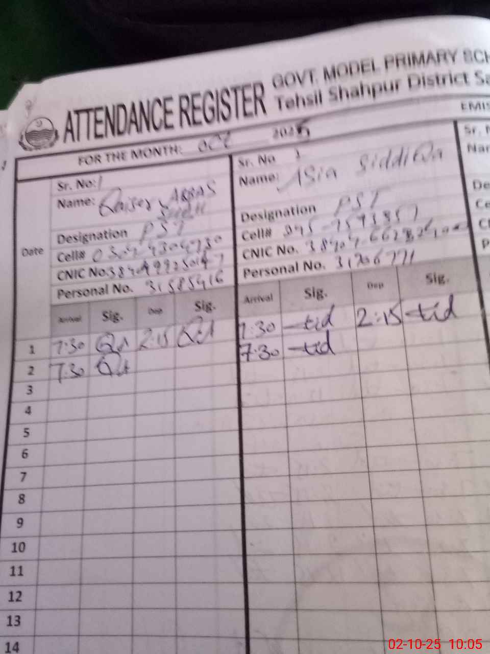 | Name: QA**** AB**** SH**** Designation: (School Headmaster's/Headmistress's) PST Phone/Cell Number: 03**** |