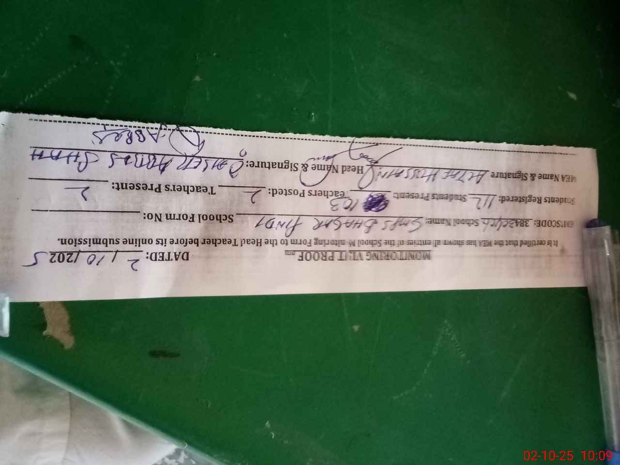 | Attendance Register | Head Teacher | MEA with School | Visit Proof |