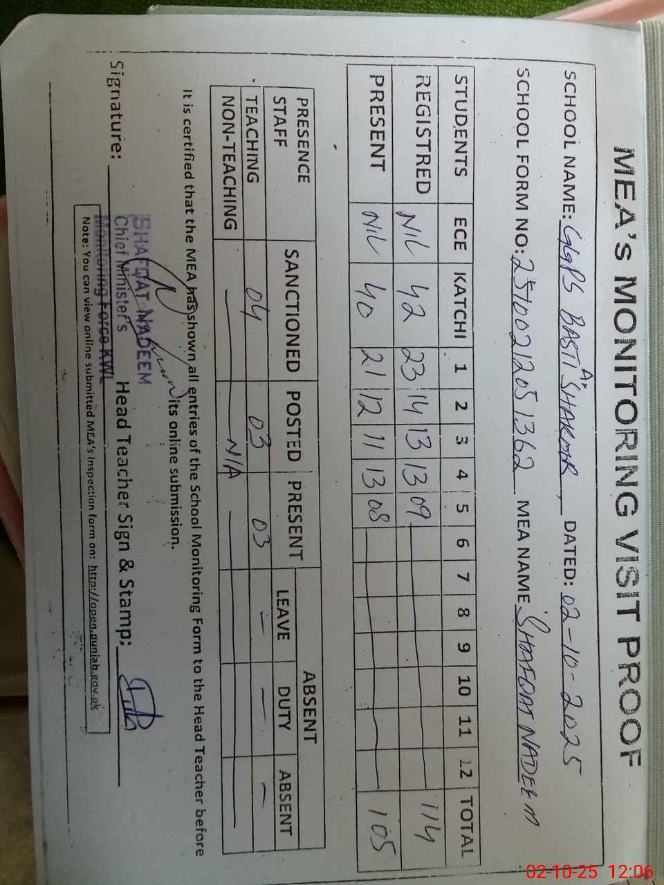 | Certified that this School was Inspected by the Undersigned MEA/DMO Today and the Information Stated Above is as Per Record. | |||||