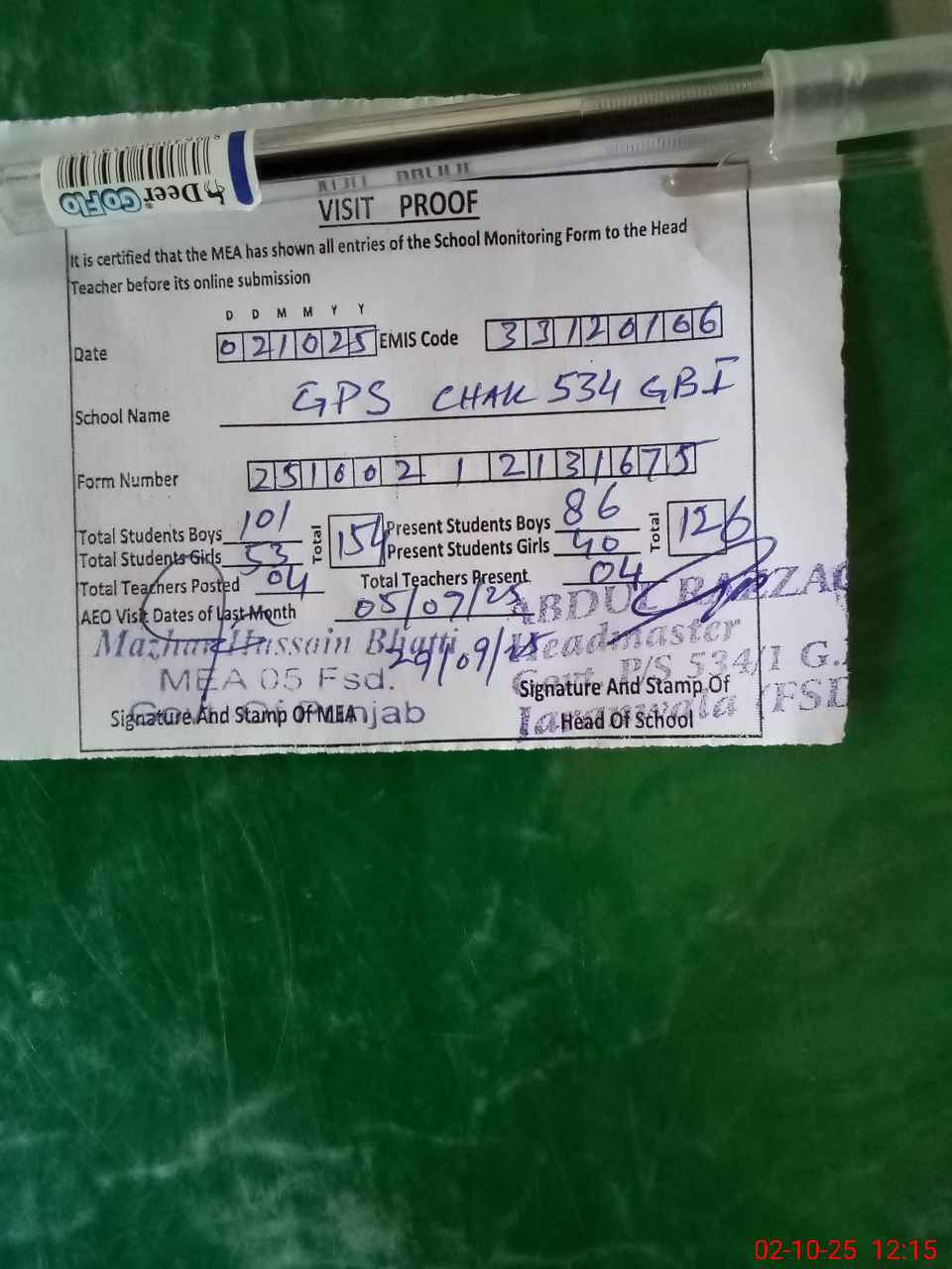 | Attendance Register | Head Teacher | MEA with School | Visit Proof |