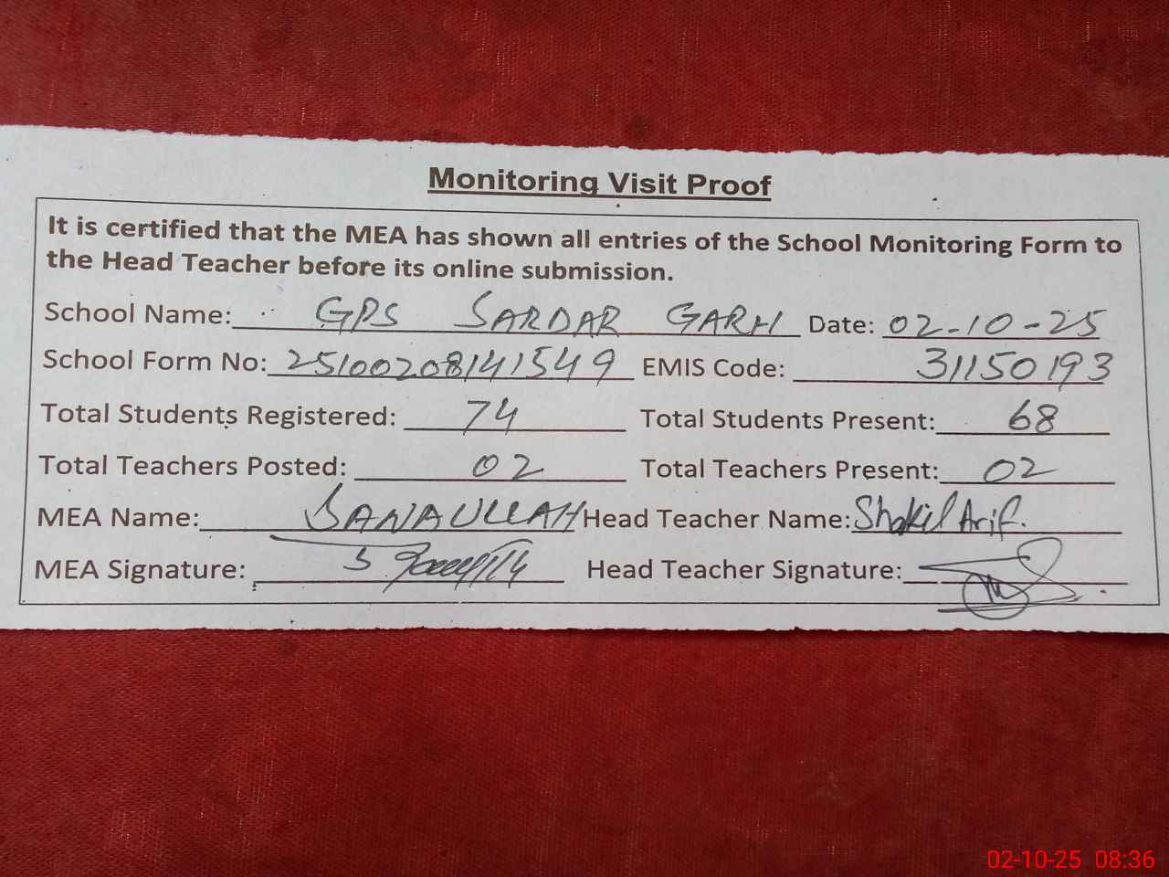 | Attendance Register | Head Teacher | MEA with School | Visit Proof |