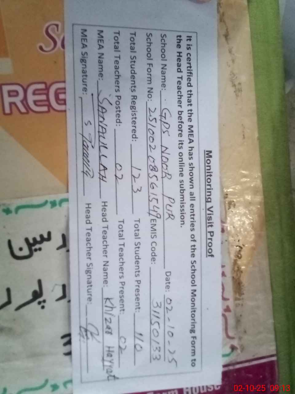| Attendance Register | Head Teacher | MEA with School | Visit Proof |