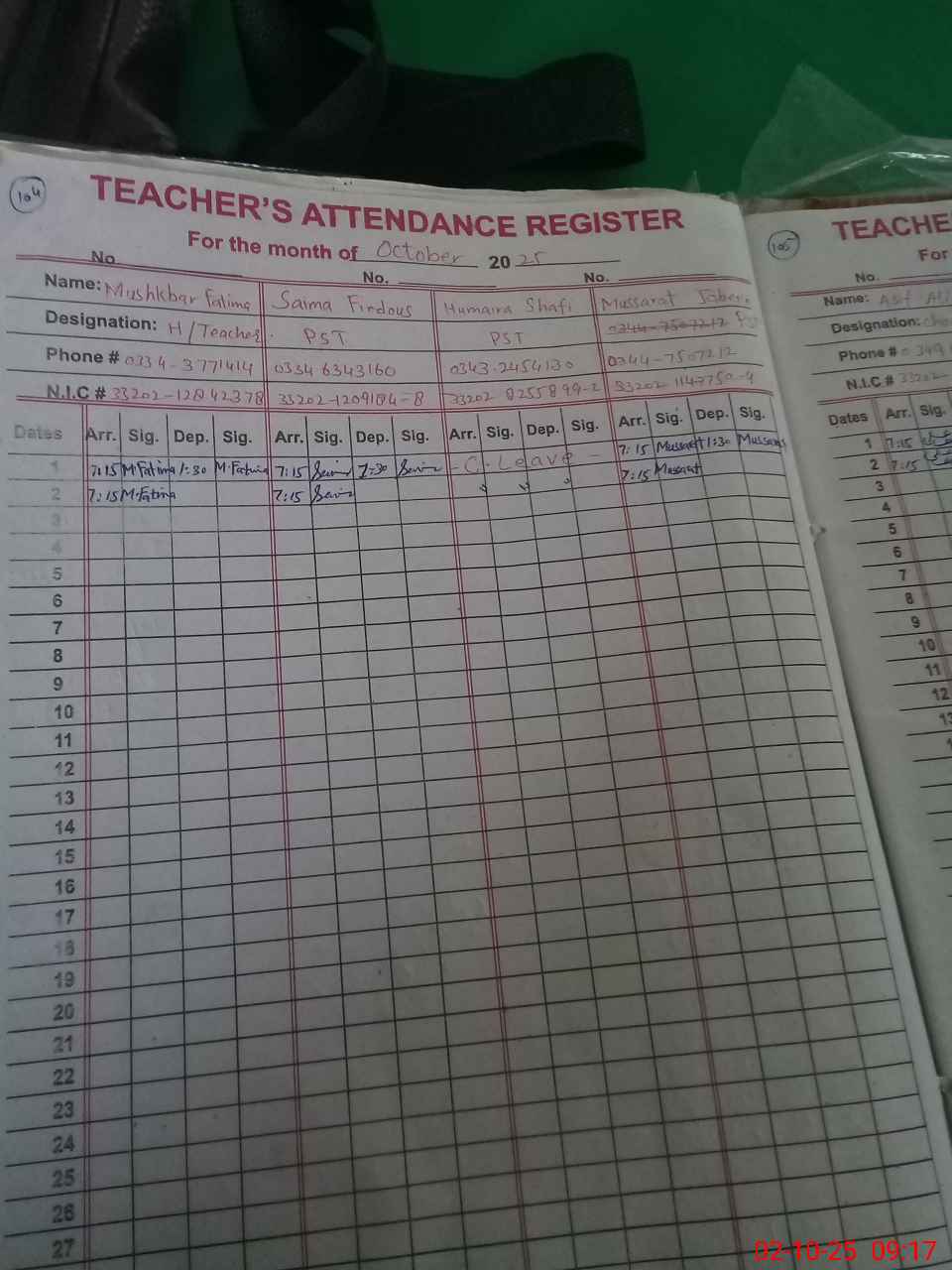 | CNIC | Full Name | Designation | R/C | Absence during last cal. month |
