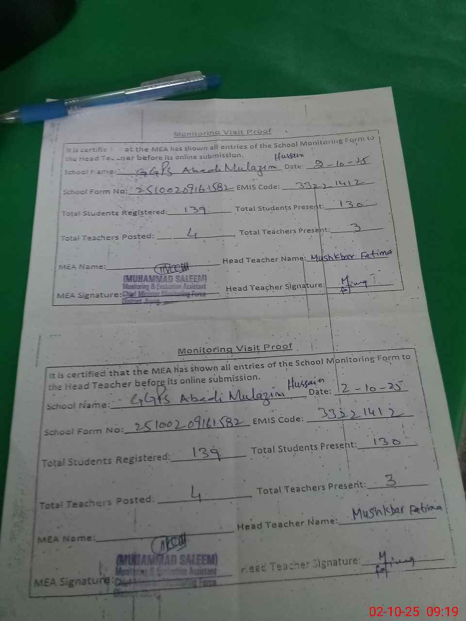 | Attendance Register | Head Teacher | MEA with School | Visit Proof |