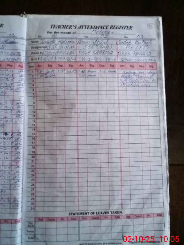| CNIC | Full Name | Designation | R/C | Absence During Last Calender Month |